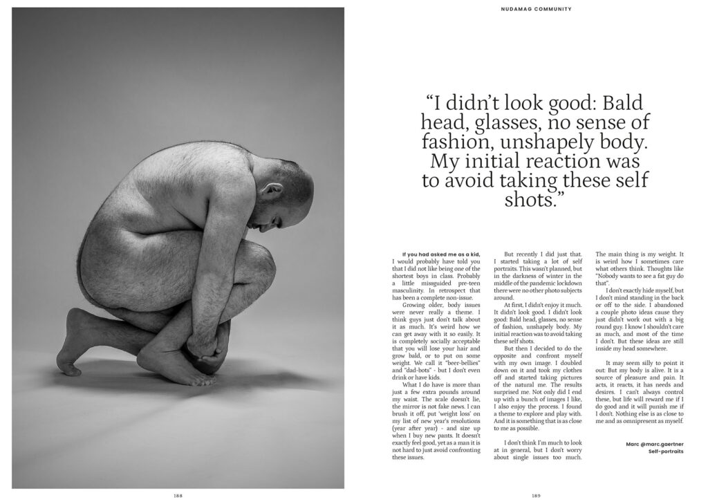 Yet there was something more about the account than nice pictures: there was outspoken activism towards „theme of self-acceptance, body positivity, freedom and anti-censorship.“ (taken from the self description) And one way this manifested was releasing a little online-magazine called „Nudamag“. It had a bunch of NYG photos (both of her as model and as photographer) but people could also submit their own work. There was a wide variety of different people, all kinds of body types, all kinds of humans. So I submitted some images myself. And they were released in one of the issues. I had gone from somebody discovering self portraiture to somebody whose work got published within like 3 months. And I really liked the images too…